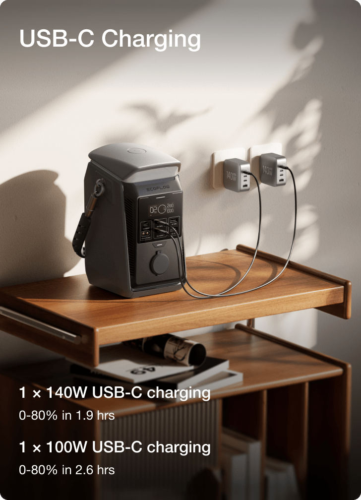 Enjoy flexible recharging via USB-C, car charging, or solar panels for reliable power in any outdoor scenario.