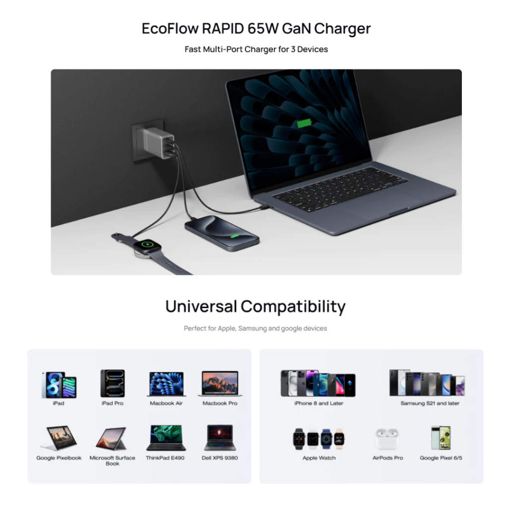 Dengan kemampuan untuk mengisi daya hingga tiga perangkat secara bersamaan dan desain yang portabel, EcoFlow RAPID 65W GaN Charger menjadi pilihan yang praktis untuk kebutuhan pengisian daya Anda.
