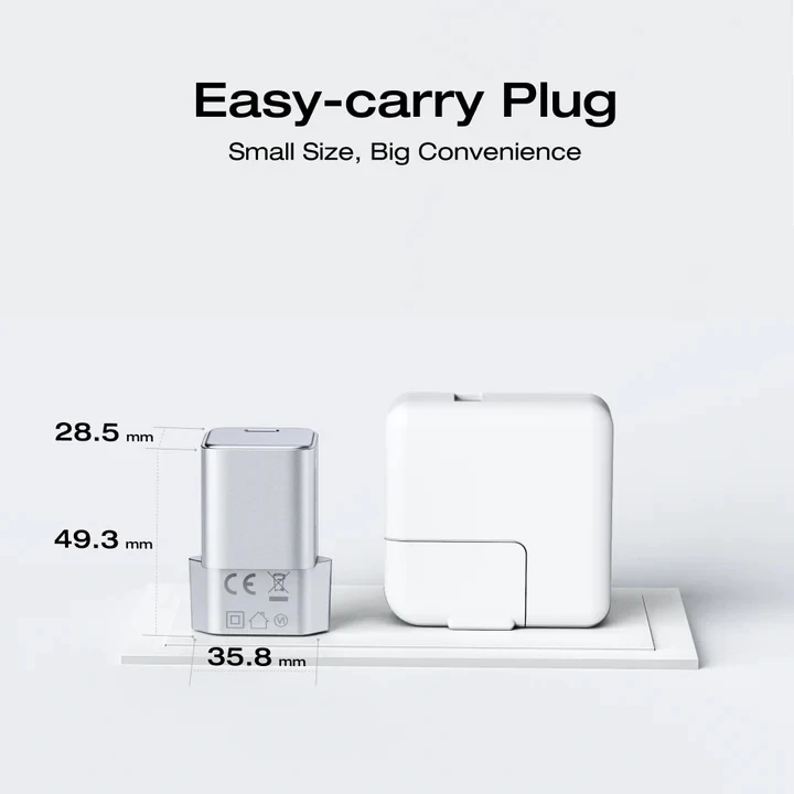 Desain kompak degan colokan yang dapat dilipat, membuatnya 40% lebih kecil dibandingkan pengisi daya standar.