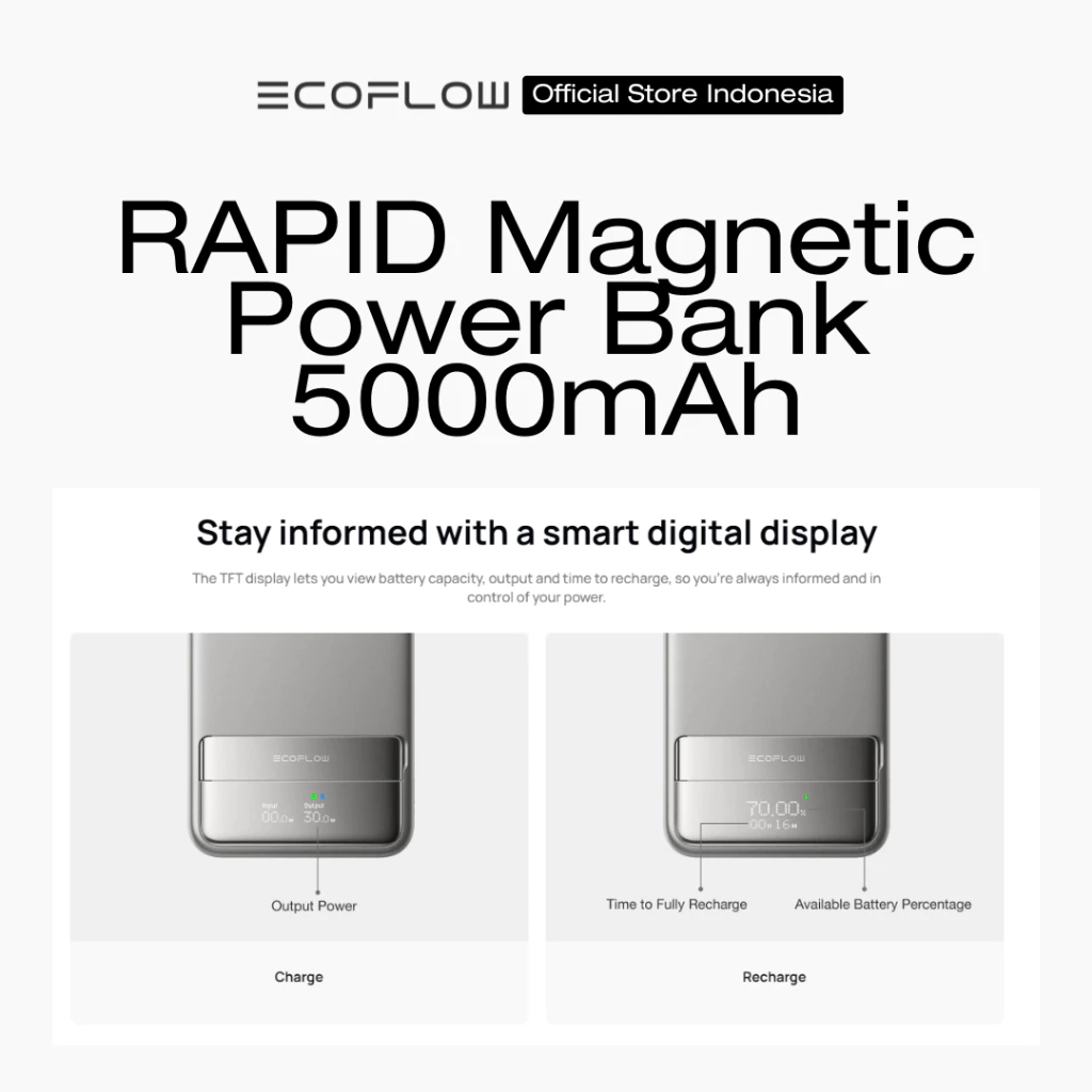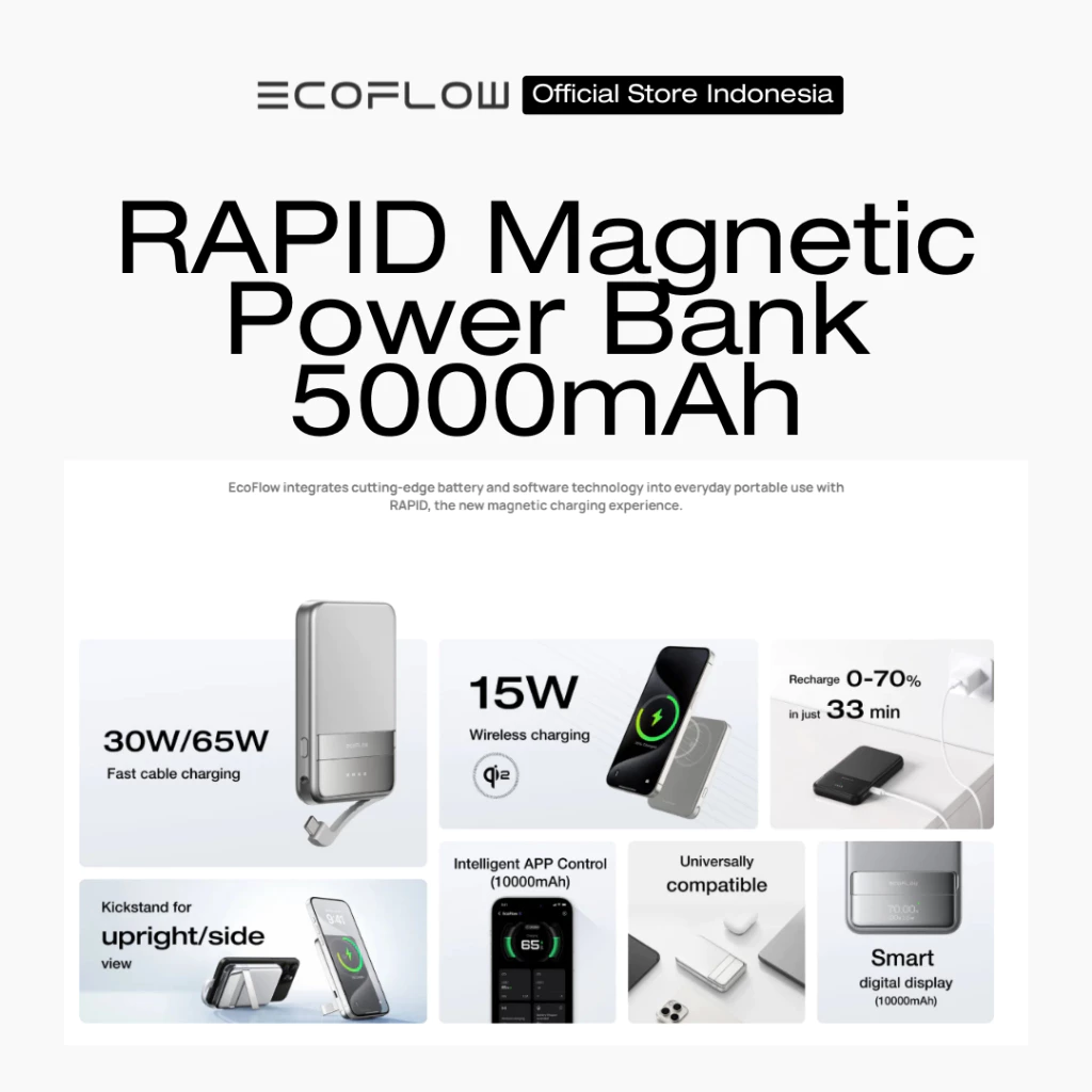 EcoFlow RAPID Magnetic Power Bank adalah power bank nirkabel dengan kapasitas 5000mAh yang dirancang khusus untuk perangkat Apple dengan fitur MagSafe. Dengan teknologi Qi2, power bank ini menawarkan pengisian nirkabel 15W yang lebih cepat dibandingkan standar Qi1 7,5W.